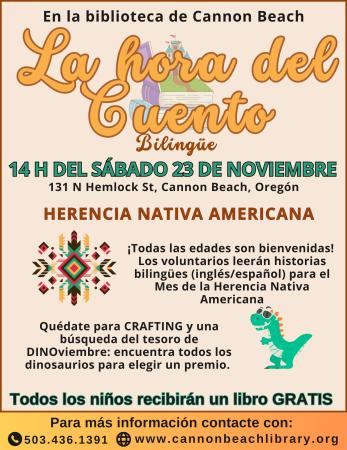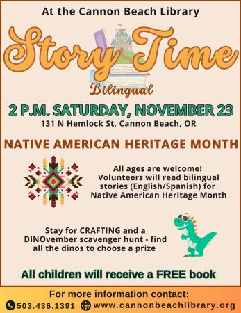 Join us at the Cannon Beach Library Saturday, November 23rd at 2 p.m. for bilingual stories about Native American Heritage in both English and Spanish. Stay for crafting and a Dinovember-themed scavenger hunt. Find all the dinos and choose a prize! All ages are welcome.