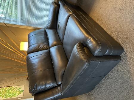 Dark green heavy duty leather. Non-smoker, No scratches, stains or marring. This is made with really tough leather! I have a small dog and it doesn’t show any wear. Seriously!
