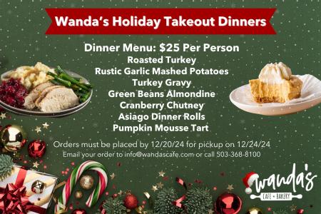 $25 per meal. Email your order to info@WandasCafe.com or call 503-368-8100. Order by tomorrow, 12/20/24.