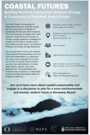 Saturday, January 18, 2025, at 12:00 PM. North Coast Communities for Watershed Protection (NCCWP) invites you to St. Mary by the Sea Catholic Parish in Rockaway for a presentation by Master of Landscape Architecture (MLA) students from the University of Oregon (UO). Their research, Coastal Futures, focuses on climate change adaptation strategies for coastal communities in Oregon and is led by Ignacio López Busón, a UO Assistant Professor of Climate Change Resilience.