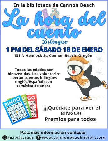 Join us at the Cannon Beach Library for Story Time and stay for BINGO! There will be prizes for all participants. Volunteers will read bilingual stories (English/Spanish) with a January theme. All ages are welcome.