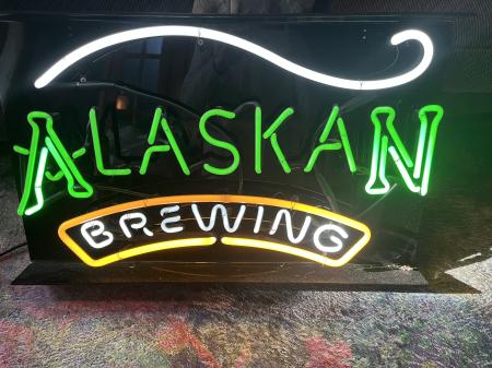 Sign in great condition. Size is , outside edge area, 19” tall x 30” wide. Has chain for hanging on the wall.