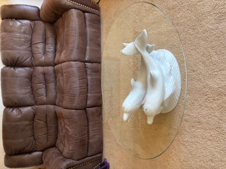 Oval coffee table with tempered glass topper & stone dolphin base