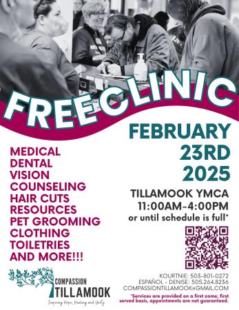 Compassion Clinic is a FREE medical and dental clinic February 23rd from 11am to 4pm at the Tillamook County Family YMCA offering medical and dental appointments to anyone in need—no insurance or documentation required!