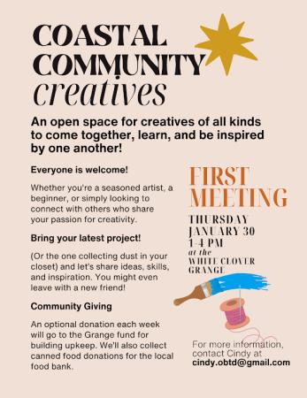 We will meet at White Clover Grange on February 27, 2025 from 1-4. Bring water to drink, all other materials will be supplied.