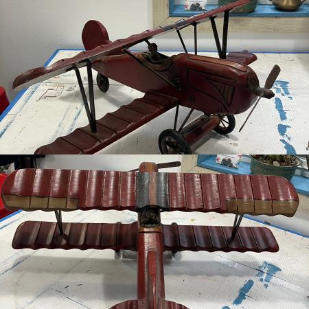 3) vintage Bi – plane 30” wide & 28” long. Carved wood & metal accents including a propeller that spins, rubber wheels, and little dude manning the controls. $90
