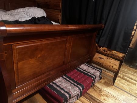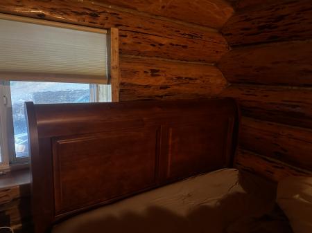 Rich colored wood Sleigh style queen frame in perfect condition. (Pics in this lighting don’t do it justice)