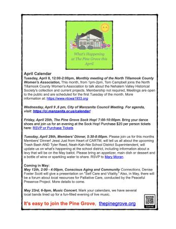 What’s Happening at the Pine Grove Community House in April Posted on April 8, 2025April 7, 2025 by North Coast BBQ Submitted By: robinwpeterson@gmail.com – Click to email about this post Check out what is happening at the Pine Grove this month. Hope to see you there!
