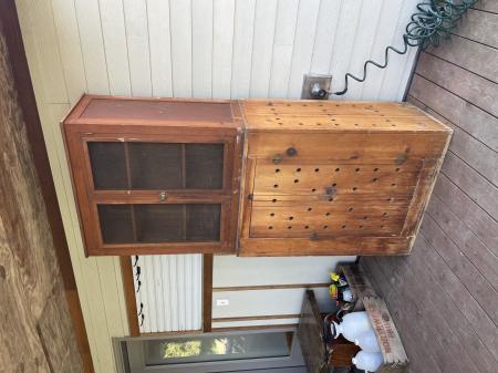 Circa 1920’s? Canning cupboard built by my grandfather and used by generations. Sturdy with some water damage at base. Could use new screens but it would be easy to add. It’s in two pieces; top and bottom so pretty easy to move. $50.