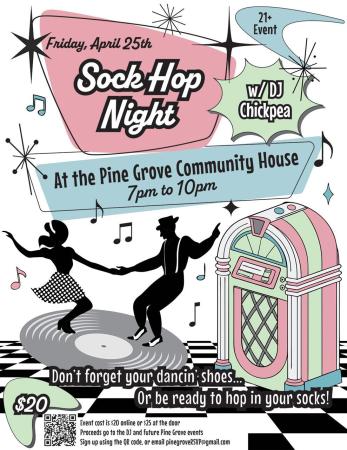 Sock Hop at the Pine Grove Community House on Friday, April 25th, 7-10pm. Grab your poodle skirts and your dancing shoes and help us celebrate our beautiful new floors. See you there!