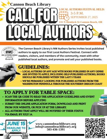 The Cannon Beach Library’s NW Authors Series invites local published authors to apply to our first Local Authors Festival on Saturday September 27th, from 3-5 p.m. at the library. Connect with visitors and members of the community, meet with other local authors, and promote and sell your published books. The deadline for applying is June 15th and all authors that apply will be notified of their status via email by July 14th.