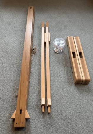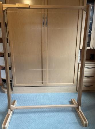 I have a beautiful display rack for sale. It’s in excellent condition. This is a custom designed rack built by a wonderful female master wood worker in our community. Made with light weight cedar. Everything breaks down into small components and fits together by hand with wooden pegs and threaded bolts. I have used it to display cards and art prints at markets (see photos). Includes a French cleat to hang a sign from the top rail. Dimensions are 71.5″ tall x 51″ wide. Footings are 26.5″ deep Comes with all the fixin’s. I am asking $100. Email or text 503-348-6288 if interested.