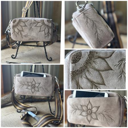 Elevate your style with this hand-burned suede crossbody bag, featuring an intricate sunflower and vine design. Every detail is freehand burned, ensuring no two bags are alike—just like you. Whether you’re strolling through a farmers’ market, heading to a festival, or embracing everyday elegance, this bag brings a touch of artisan craftsmanship to your wardrobe.