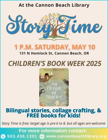 It’s Children’s Book Week and we’re celebrating with STORY TIME! Come to the Cannon Beach Library Saturday, May 10th at 1 p.m. to listen to bilingual stories (English/Spanish). Stay for collage crafting – come make a card or something special for mom. Free children’s books for participants. Best suited for ages 0-8, but all ages are always welcome.