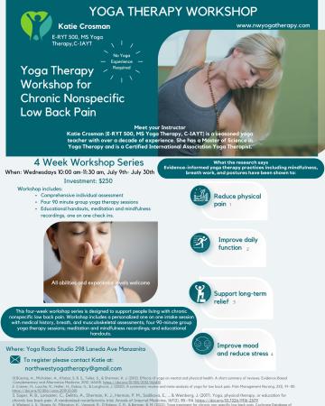 This four-week workshop series is designed to support people living with chronic nonspecific low back pain. Workshop includes a personalized one on one intake session with medical history, breath, and musculoskeletal assessments; four 90-minute group yoga therapy sessions; meditation and mindfulness recordings; and educational handouts.