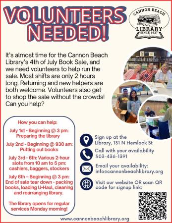 It’s almost time for the Cannon Beach Library’s 4th of July Book Sale, and we need volunteers to help run the sale. Most shifts are only 2 hours long. Returning and new helpers are both welcome. Volunteers also get to shop the sale without the crowds! Can you help?
