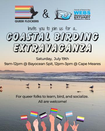 Friends of Netart Bay WEBS is excited to partner with Queer Flockers, a Portland-based queer birding group, to host a Coastal Birding Extravaganza for queer folks and bird lovers to learn, bird, and be in community on Saturday, July 19th, 9:00 a.m.! We will explore the tidal flats of Tillamook Bay, the sandy beach of Bayocean Spit, and the dramatic cliffs of Cape Meares. This year one hundred and nineteen different species of birds have been spotted on and around the spit, twenty eight in the month of June alone. “We hope to see many of these species while taking in the diverse habitats of mudflats, grasslands, beaches and forests”, shares WEBS director Chrissy Smith. Come join us for what’s sure to be a fun morning of hiking, exploring, birding and socializing!