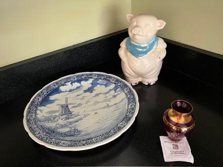 For Sale, Dutch charger plate, Shawnee Cookie Jar, Bottles, Murano Glass Vase