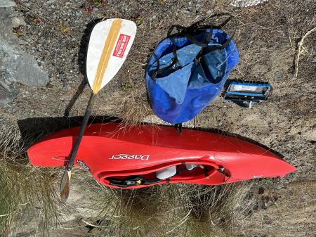 Dagger Whitewater kayak/Playboat with 2 oars and spray skirt with fins for surfing in ocean.