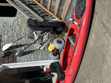 Necky Tandem Kayak with child’s jump seat with oars, high end dolly, and cockpit covers