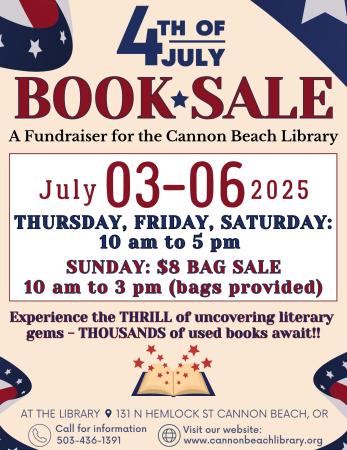 The Fourth of July Book Sale is a vital fundraiser supporting the Cannon Beach Library, one of the oldest non-profit libraries in Oregon. Every purchase helps us continue to provide essential library resources and services to our community of locals and visitors. We need your help! Over 120 volunteer slots need to be filled during the sale. To volunteer or for more information, email manager@cannonbeachlibrary.org.