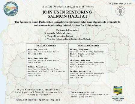 For more information about the tour or about the Nehalem Landowner Engagement Initiative please contact the Nehalem Bay Watershed Council at info@nehalemwatershed.org. More information on the Nehalem Basin Partnership and our outreach initiative can be found at www.nehalembasinpartnership.com/Nehalem-landowner-engagement-initiative . The Nehalem River Ranch website is www.nehalemriverranch.com . The Backyard Planting Program at Tillamook Estuaries Partnership can be found at www.tbnep.org/programs/habitat-restoration/backyard-planting-program/ .