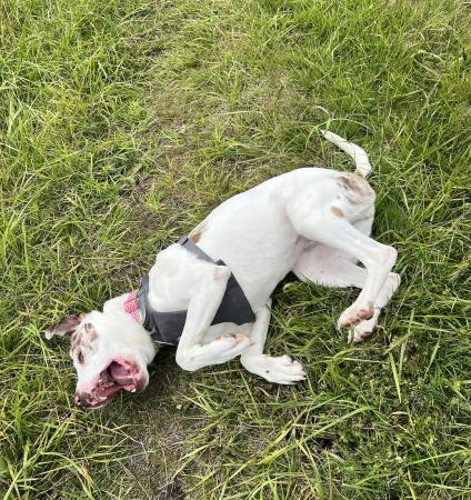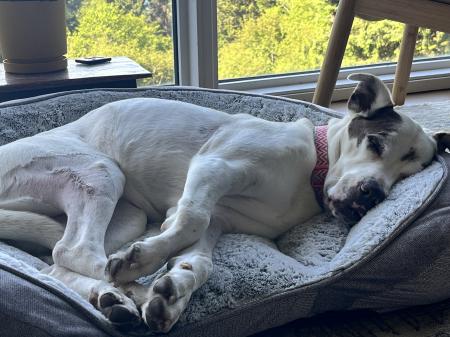 Some things scare Millie, likely a reminder of darker times. When that happens, she responds well to quieting and redirecting, unless there’s fireworks at which point she disappears under the nearest bed. Though big and strong, she strives to be a lap dog and often succeeds.