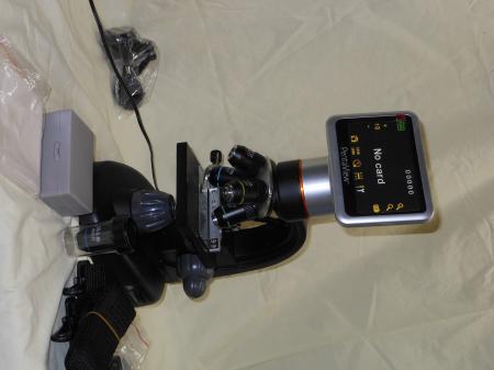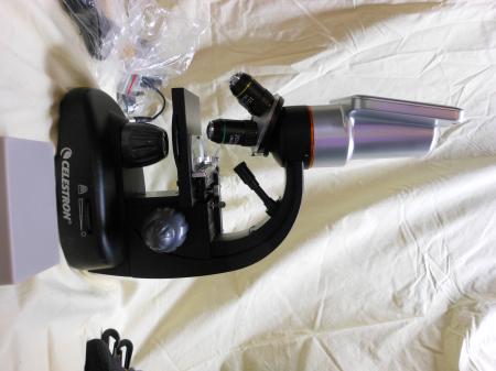 Selling very lightly-used by one original owner, Celestron Pentaview Digital Microscope (22452) with accessories, original packaging, hard carry case with top-mounted handle. Features 4.3″ LCD movable touchscreen; 5Mpx camera; 5 achromatic objective lenses: 4x, 10x, 20x, 40x, 60x magnification plus digital zoom enhancement to 2400x. Coarse and fine focus knobs. Has 4GB SD card with slot for storing photos and videos, TV and PC output cords/plugs and AC/DC plugs. Optional battery mode. 10 prep’d slides of vegetation specimens in small shock-proof case. Ideal for labs, schools, scientific research, and demonstrations. $620.