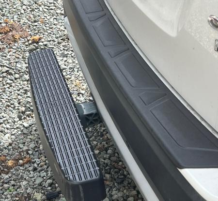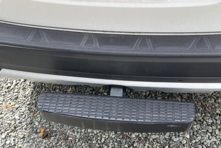 BumpStep is a trailer hitch-mounted bumper protector available in two widths: 12″ and 24″ (BumpStep XL), that defends your truck or SUV against rear end accidents, dents and scratches. Both options are molded from two proprietary resins for added strength and impact resistance. The base is molded from a sturdy material that resists flexing, while the second layer is a softer, impact absorbing material, lessening the blow caused by minor accidents. You will be happy to have it when that stray grocery cart or hard-to-see fire hydrant shows up! As a secondary benefit, and as the name implies, BumpStep doubles as a step, helping you reach your vehicle’s roof. BumpStep can support up to 300 lbs., providing you access to a roof rack, bike or kayak, or to wash the roof of your vehicle and brush off snow. For standard SUVs and trucks, choose regular BumpStep, and for larger vehicles, choose BumpStep XL to protect a greater portion of the vehicle’s bumper. New price is $127. Your price on this lightly used (one month or so) BumpStep is $80.00