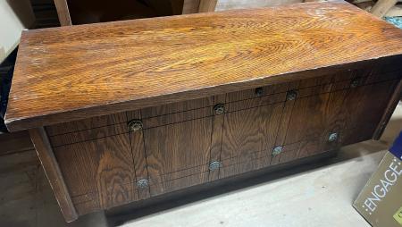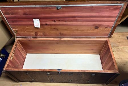 This chest has an authentic cedar wood lining and seals tightly to keep woolen and other goods safe from insect damage. The outside is a bit scuffed, but could easily be refinished. I think it was made by Lane. Though not labeled, it does have a serial number on the bottom. You can pick it up in Cannon Beach for $20. Contact dldave13@gmail.com for more information.