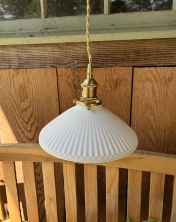 Brass pendant light with ceramic shade approx 9″ diameter $25
