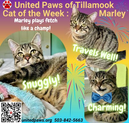 Marley wakes up full of energy and loves playing “fetch” first thing. Like a dog, he will chase after a thrown toy and bring it back! His foster describes Marley as “a labrador in a cat body”! He even knows his name and will come when he is called! A pat on his side will get him going again, chasing and retrieving more toys. When he is not playing fetch, Marley enjoys chasing and catching bugs. Marley is curious, playful, and will provide hours of entertainment. After a good round of playtime, Marley is happy to lounge in a sunny spot in the house.