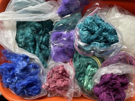 Many thanks to the fiber arts who responded to my first ad. I still have some beautiful dyed kid mohair in vibrant colors, dyed silk noil, and some dyed merino roving. Several fun packs of dyed bunny too. All at $2/oz.