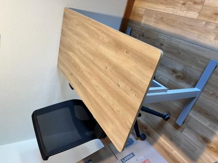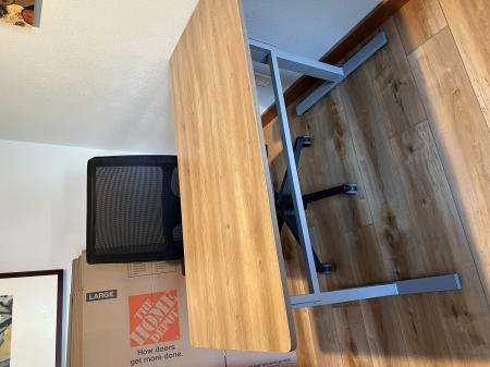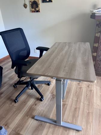Adjustable height standing/sitting desk (crank, not electric ~ very easy to adjust height) $50; Ergonomic desk chair, lots of adjustment levers, also selling for $50; $100 for both items.