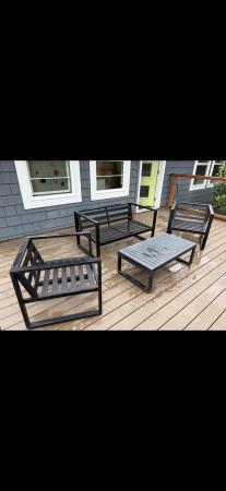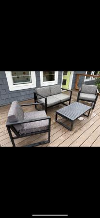 Love seat with two chairs, cushions, and table. Made of aluminum and stored indoors when not n use. Good shape. $200.00