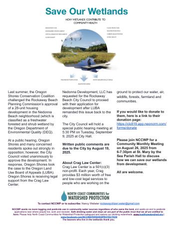 Please join us on August 26 at 6pm at our monthly meeting to discuss how we can save our wetlands from development. Nedonna Development, LLC