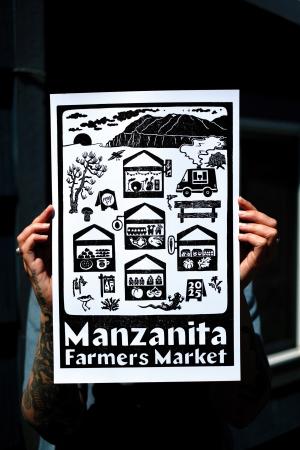 We will be debuting our first commemorative Manzanita Farmers Market poster this Friday! We hope to start a tradition of having different art to mark each year of the market. The funds raised from poster sales will be used to help fund the market, and particularly our Triple Up SNAP match program. This year’s poster was made by board member and long time vendor Jordan Gulaskey, and is an original linocut portraying some of the unique offerings of our beloved farmers market! These will be for sale in the market info booth, just inside the entrance. Make sure to get yours!