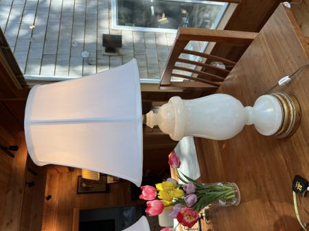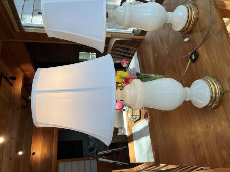 Two white marble lamps with gold painted bases and neck. Silk lamp shades included. These are in good vintage working condition. Please note small stain on lamp shades (pic included).