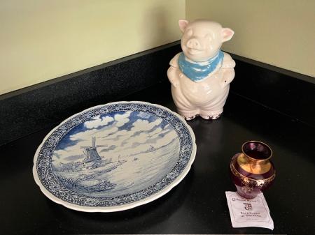Some antiques- bottles from desert cookie jar, Dutch platter, Venetian glass red / gold vase