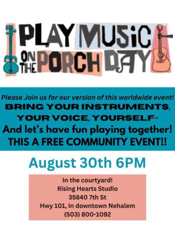 A reminder for our “Play Music on the Porch Day” Open Music Jam tomorrow, Saturday August 30th, 6 PM at Rising Hearts Studio. Please join us for this worldwide event- bring your instruments, your voice, yourself and let’s have fun playing music together! This is a FUN, FREE Community Event Open to ALL!