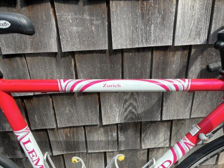 The 2003 LeMond Zurich is a steel-framed road bike with a Reynolds 853 Pro double-butted steel alloy frame and a Bontrager Race Lite carbon fork. It was equipped with a Shimano Ultegra 9-speed groupset, Bontrager Race Lite wheels, and triple chainring crankset.