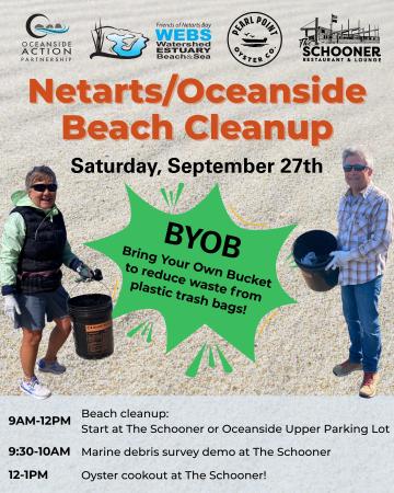 WEBS and OAP will have welcome tables set up at The Schooner Restaurant and the upper parking lot at Oceanside Beach, so volunteers can choose where to start the day. “Let’s take this opportunity to clean up the beach with friends or family, or expand your community by teaming up with fellow volunteers,” says Marina Dreeben, WEBS stewardship coordinator. Marina goes on to add “In addition to cleaning up the beach, join us for a marine debris survey demonstration at The Schooner at 9:30am to learn how debris is monitored on the beach year-round, and how you can help!” In our efforts to reduce waste, instead of using plastic bags, please bring your own bucket to collect debris. There will be some extra buckets on hand if needed.