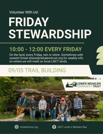 Join us this Friday for a trail building stewardship work party on Lower Nehalem Community Trust land in Nehalem. Rain or shine, tools provided, and sometimes something sweet 🙂
