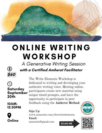 The Write Elements Online Writing Workshop offers a safe place to create new material. Utilizing unique writing prompts, supplied by the facilitator, you can finish the workshop with up to three new pieces of writing.