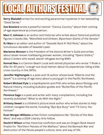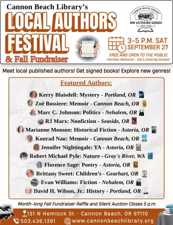 Let’s highlight our LOCAL AUTHORS who will be joining us at the Cannon Beach Library on Saturday, September 27th from 3-5 p.m. Meet local published authors, get signed books, explore new genres! Kerry Blaisdell writes fun and exciting paranormal mysteries in her bestselling “Dead Series.” Zoe Bossiere wrote a powerful memoir “Cactus Country” about their coming-of-age experience as a trans person. Marc C Johnson is an author and historian who writes about historical political figures in books like, “Mansfield and Dirksen; Bipartisan Giants of the Senate.” RJ Marx is an editor and author of “Seaside Rock N’ Roll Riots,” about the tumultuous decades of Seaside’s past. Marianne Monson is the President of the Astoria Writer’s Guild and writes about lesser-known trailblazing pioneer women, including “Opera Sisters,” about 2 sisters who saved Jewish refugees during WWII. Konrad Nau is a Cannon Beach Local and retired physician who wrote “I Rode a Bike for 50 years,” a laugh-out-loud memoir about his experiences riding a bike cross-country in the 1970s. Jennifer Nightengale is a poet and YA author whose book “Alberta and the Spark” is a coming-of-age story about a young girl in the Pacific Northwest. Robert Michael Pyle is a lepidopterist and PHD who writes about Biology and Natural History, including Audubon guides and “Butterflies of the Pacific Northwest.” Florence Sage is a poet and writer with many compilations, including the recently published “What to do With the Night.” Brittany Sweet is a children’s picture book author who writes stories to help children navigate the world, including “Bye Bye Buoy” and “I’ll Carry You Forever.” Evan Morgan Williams writes fiction compilations like “Stories of the New West,” and was a 2024 Literary Arts Fellow. David H Wilson writes historical nonfiction and was an Oregon Book Award finalist for “Northern Paiutes of the Malheur,” about the Bannack War and destruction of the Paiute people’s culture, land, and way of life.