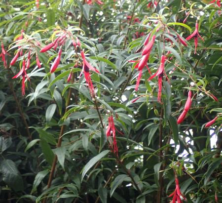 Fuchsia hatchbachii has an amazingly accurate common name: Climbing Fuchsia. 100% true. Our mature specimen peaked at 8’ after working its way through the branches of an adjacent pine tree. Quite glorious. We’ve since taken the tree out and the fuchsia’s still going straight up, but looks way better with something to climb on. Full sun or part shade, rich soil and weekly watering in its youth for years of easy amazement.