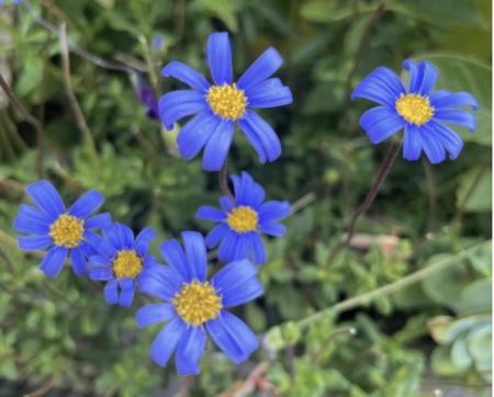 Felicia ’Tight and Tidy’ puts a smile on everyone’s face when they see it. How else can a sane person response to hundreds of miniature true-blue daisies with bright yellow eyes hovering above shiny tufts of foliage? It makes your heart break for all those Portlanders who can’t get the plant through a winter, but ours keep coming back. The trick is a cozy spot in yummy soil and weekly watering through summer. See it to believe it, as it’s blooming in the WG now.