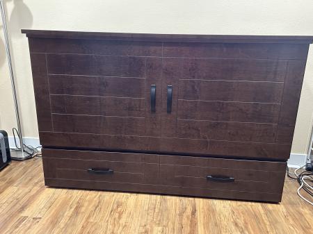 Selling Queen size cabinet bed. Moving to smaller place and won’t have room for it. Cabinet bed measures 42”high, 66 1/2“ wide , 25” deep. Large drawer at bottom for storing bedding. Easy to open or close in less than minute. Has been wonderful to have for company but also use the room as office rest of time. Asking for $1600.