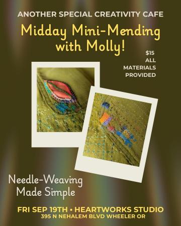 Bring a worn (but not completely tattered) woven textile, and Molly will help you patch it up using an intricate yet easy mending technique—needle weaving! Works great on worn pocket corners, rear-end mends, and cuffs (not so great for socks or sweaters). Mending materials provided.
