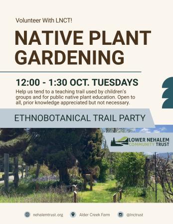 Alder Creek Farm’s Nehalem Teaching Trail is in need of a few helping hands. In October, we will meet every Tuesday at noon to tend to native plants—we welcome those with extensive knowledge and those seeking to learn about supporting local ecosystems through native plant gardening and landscaping.